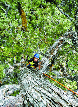 郑达雄在科考队担任领攀师,也就是说,他要攀到巨树的顶端,确定最高树梢之后,将钢尺从树梢放下至地面测量。