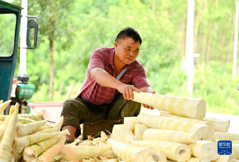 8月16日,在广西柳州市柳城县沙埔镇古仁村,农民在家门口剥笋。