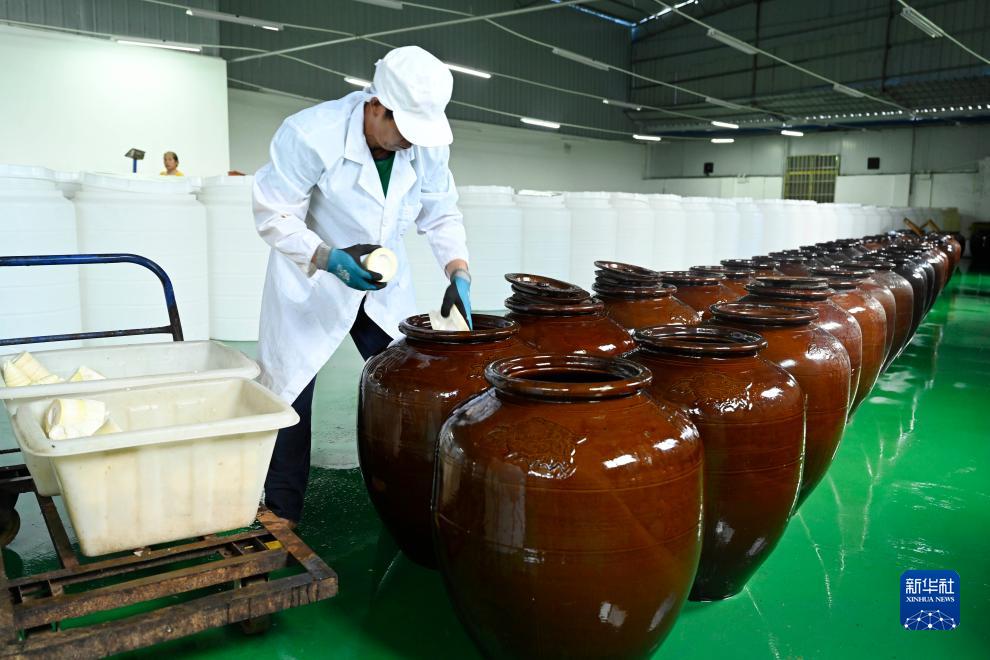 8月16日,在广西柳州市柳城县沙埔镇古仁村酸笋加工厂,工人在车间里腌制酸笋。