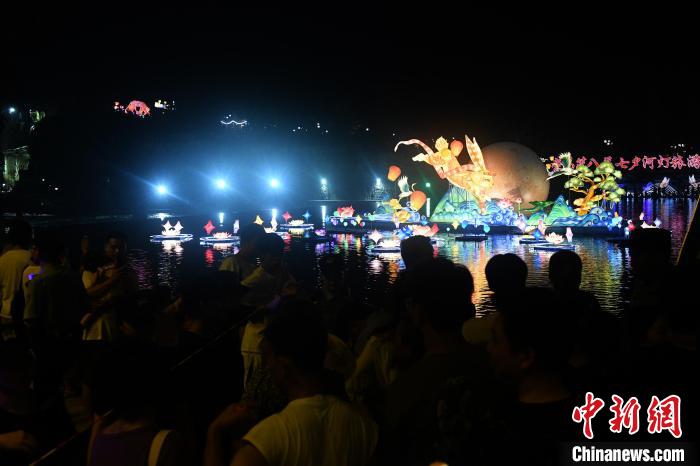 图为民众在荣昌濑溪河畔欣赏七夕河灯。中新网记者 周毅摄