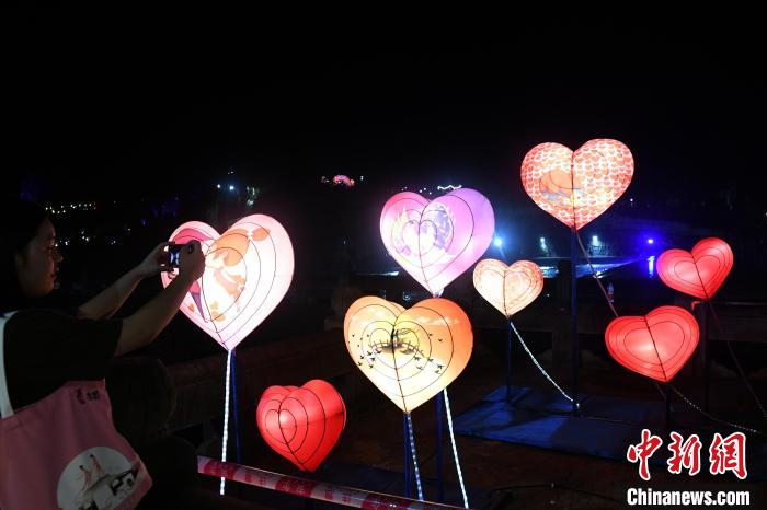 图为爱情主题灯饰吸引市民驻足拍照。中新网记者 周毅 摄