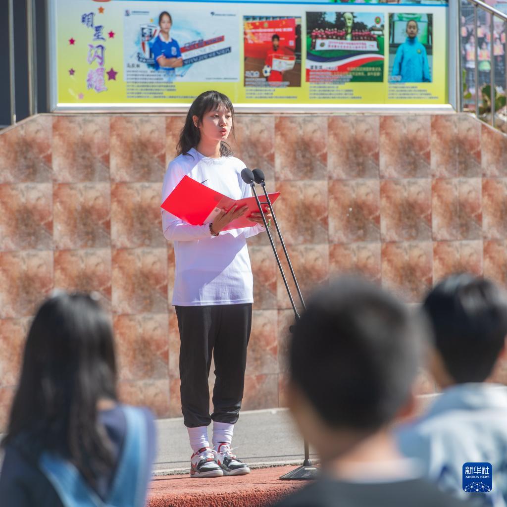 9月1日,在重庆市石柱县三河镇的三河小学,曾经的留守儿童女足队队员秦芙蓉在开学典礼上用自己因足球特长考上大学的事例激励学生。