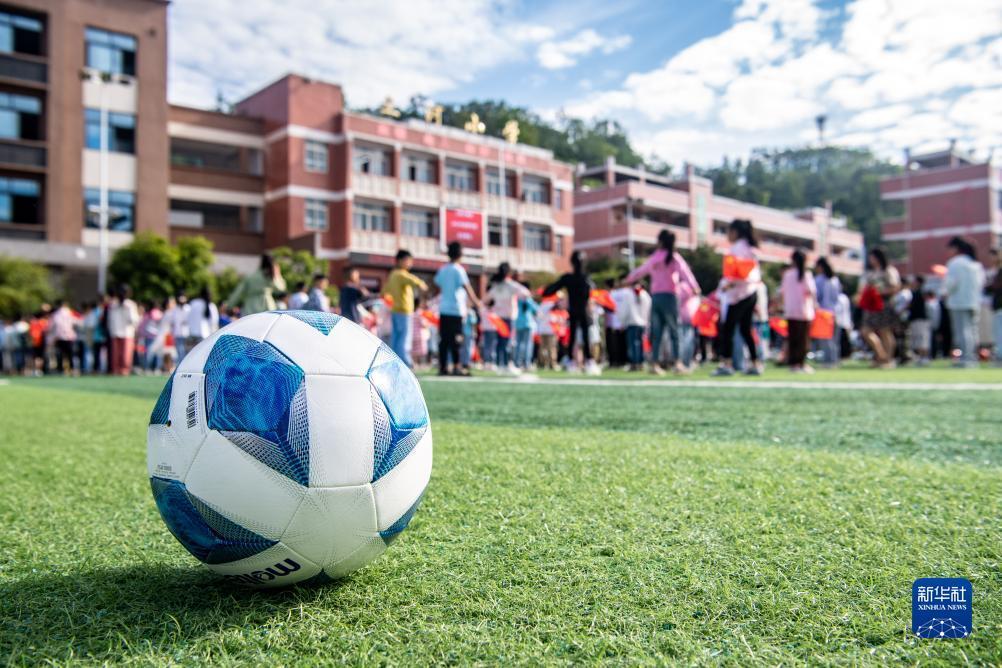 9月1日,在重庆市石柱县三河镇的三河小学,谭召瑜(中)和足球队队员们在操场上练球。