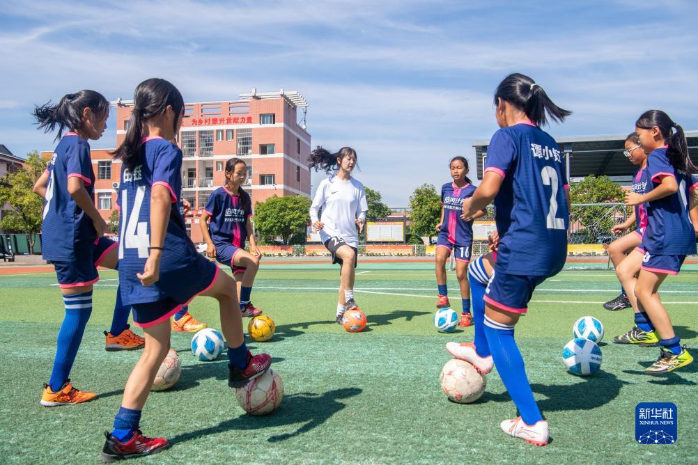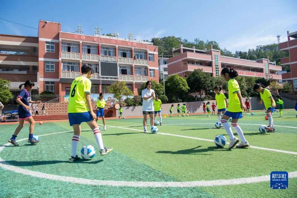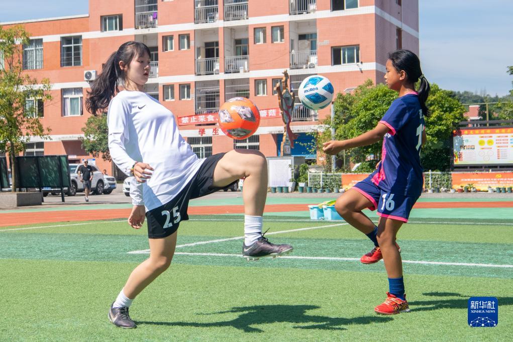 9月1日,在重庆市石柱县三河镇的三河小学,秦芙蓉(左)和足球队队员在操场上练球。