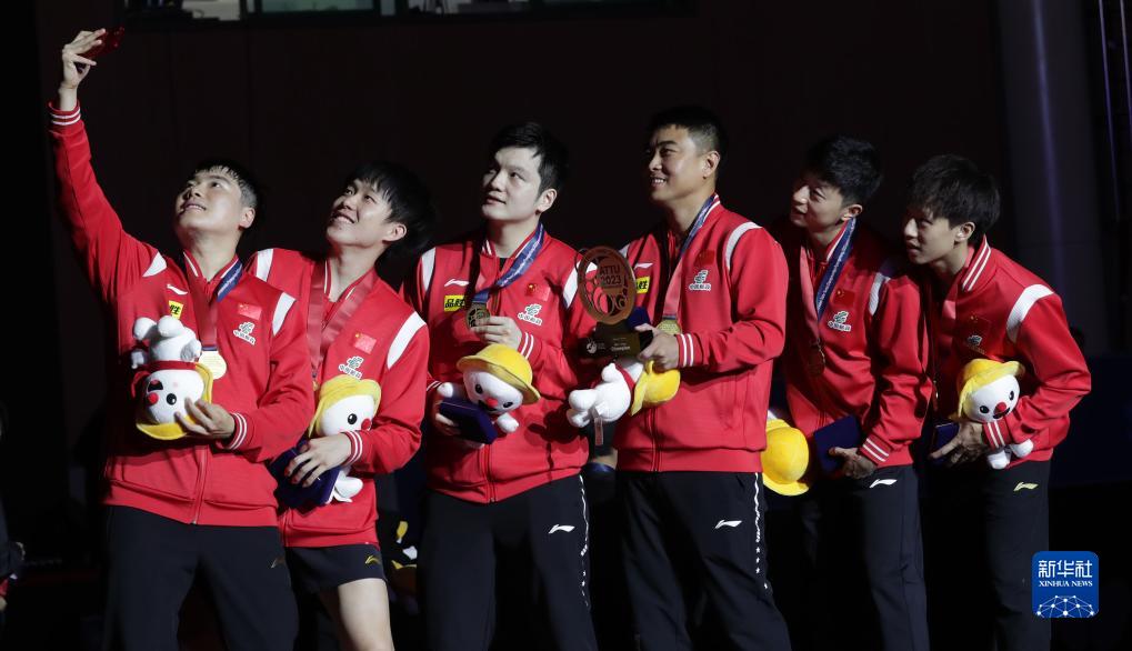 9月6日,中国队选手梁靖崑、王楚钦、樊振东、教练王皓以及选手马龙、林高远(从左至右)在颁奖仪式上自拍留念。新华社发(李相浩摄)