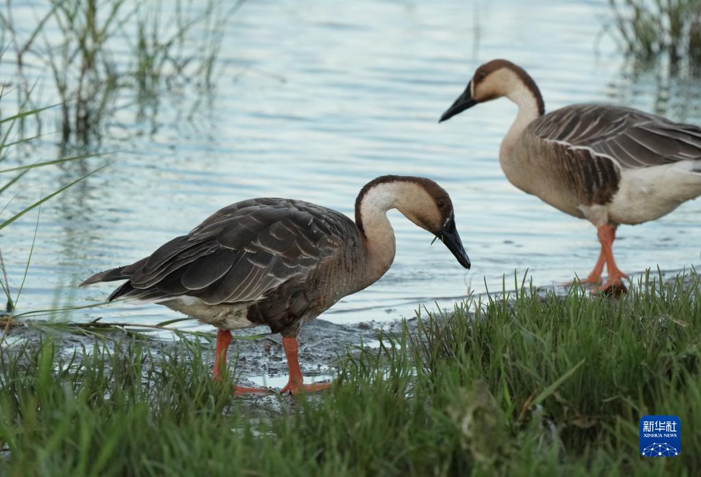 9月23日,两只鸿雁在河北省秦皇岛市北戴河区沿海湿地觅食。