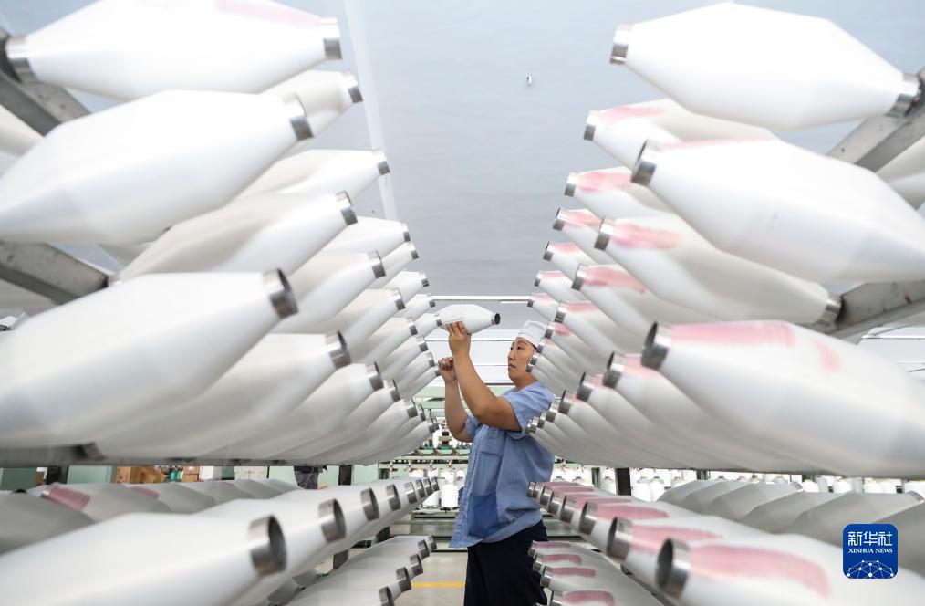10月7日,纺织工人在江苏省淮安市一车间内纺纱作业。