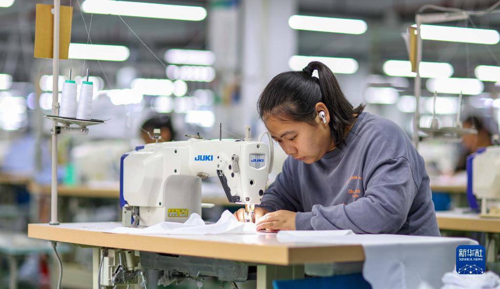10月7日,贵州省铜仁市玉屏侗族自治县一家服装生产企业的工人在生产服装。