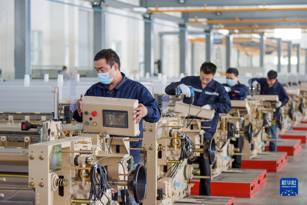 10月7日,在山东省胶州市洋河镇工业园区一家纺织机械企业,工人生产纺织机械。