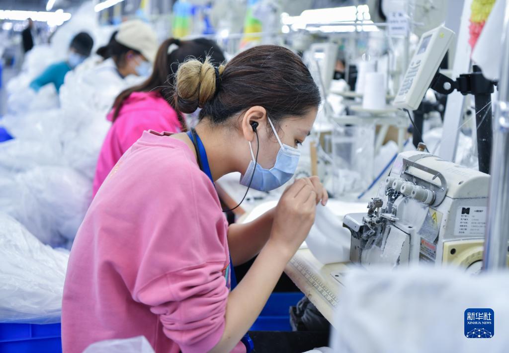 10月7日,工人在贵州省毕节市纳雍经济开发区毕节市晶煌制衣有限公司加工车间工作。