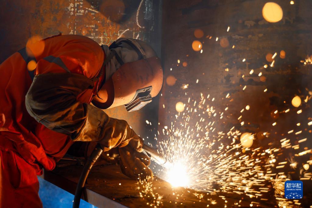 10月7日,工人在海油工程天津智能化制造基地结构预制车间进行焊接作业。