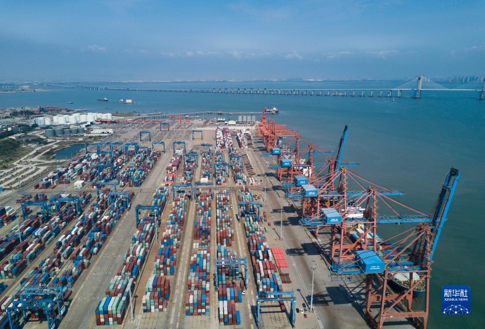 在泉州最主要的现代集装箱港石狮石湖港,大型机械在吊装集装箱(2020年7月15日摄)。