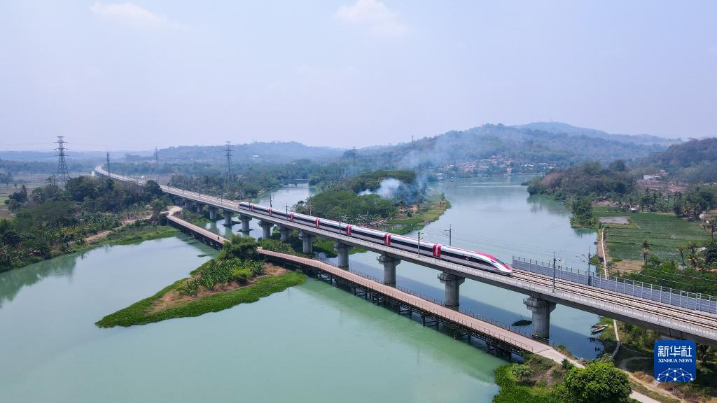 这是2023年9月30日在印度尼西亚普哇加达拍摄的一列行驶中的雅万高铁高速动车组(无人机照片)。雅万高铁是印尼和东南亚第一条高速铁路,是中印尼两国高度关注的共建“一带一路”旗舰项目,是国际上首个由政府主导搭台、两国企业合作建设和管理的高铁项目。