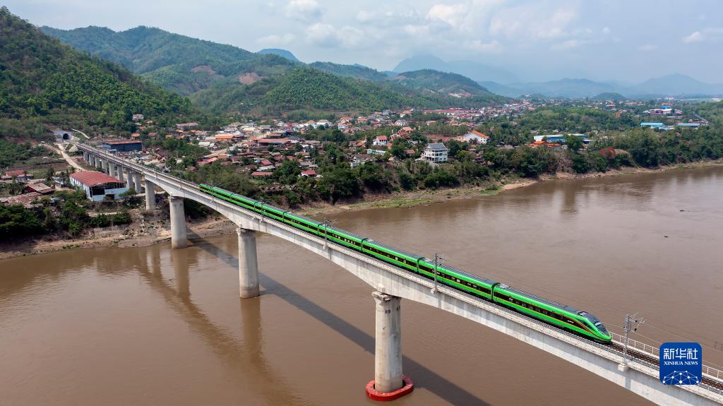 2023年5月28日,中老铁路客运列车通过老挝琅勃拉邦湄公河特大桥(无人机照片)。中老铁路北起中国昆明,南抵老挝万象,全长1035公里,是“一带一路”共商合作、共建项目、共享红利的生动例证。截至10月3日,中老铁路开通运营满22个月,累计运输货物2680多万吨,其中进出境货运量550万吨,货物品类增加至2700多种。