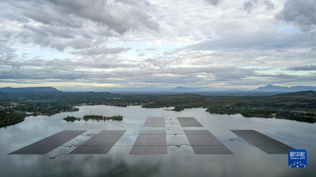 这是2022年12月8日在泰国乌汶府诗琳通水库拍摄的浮体光伏项目(无人机照片)。据介绍,该项目共安装光伏组件14.4万余片,总装机容量58.5兆瓦,每年可以减少4.7万吨二氧化碳排放,助力泰国减少对高污染火力发电的依赖。