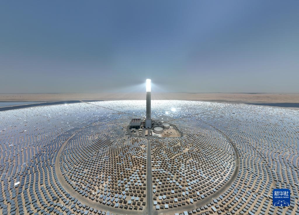 这是2022年8月15日在阿联酋迪拜拍摄的上海电气迪拜光热光伏复合项目(无人机照片)。位于阿联酋迪拜的700MW光热和250MW光伏复合项目由上海电气集团股份有限公司总包,装机规模大、技术标准高,助力阿联酋实现清洁能源目标。