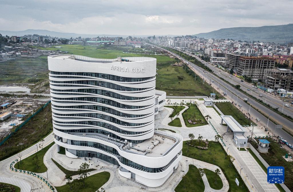 这是2023年9月10日在埃塞俄比亚首都亚的斯亚贝巴拍摄的非洲疾控中心总部大楼(无人机照片)。中国援非盟非洲疾病预防控制中心总部(一期)项目于2023年1月竣工,这是非洲大陆第一个拥有现代化办公和实验条件、设施完善的全非疾控中心。
