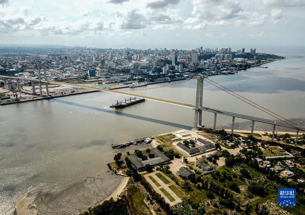 这是2019年4月8日在莫桑比克首都马普托拍摄的马普托大桥(无人机照片)。超大悬索桥马普托大桥飞架天险,横跨马普托湾,该桥极大便利了马普托湾两岸交通,成为莫桑比克纵贯南北、连接南非的交通主干道的重要组成部分。