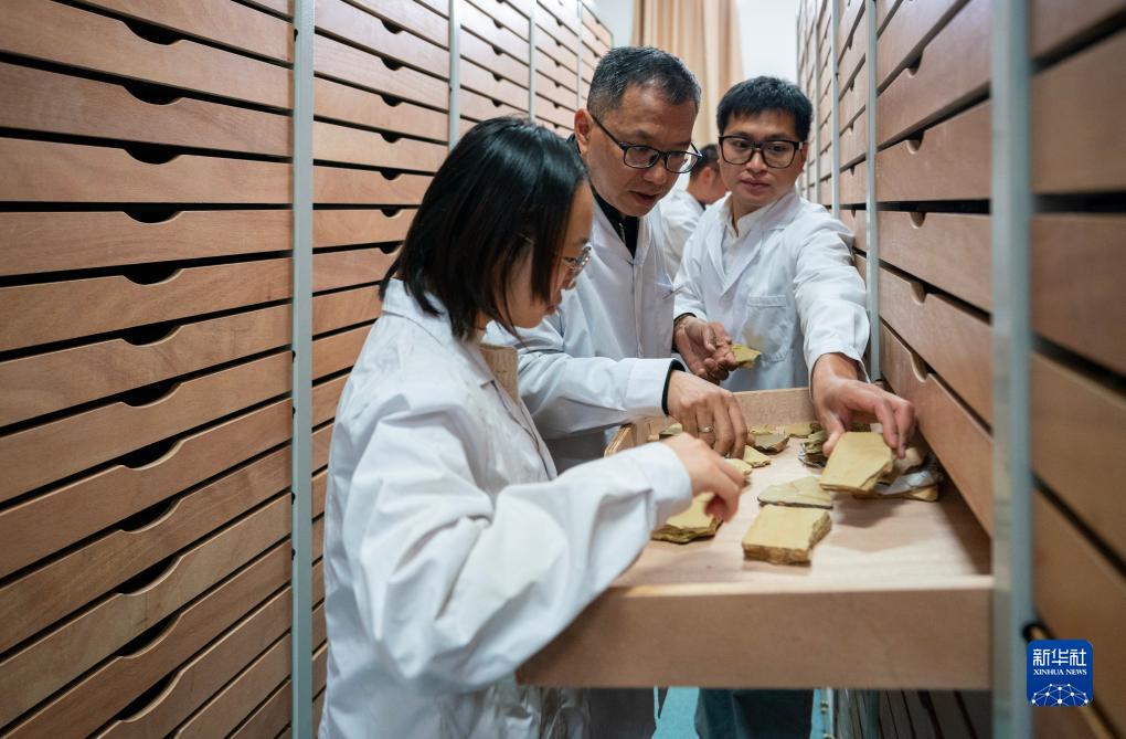 10月11日,云南大学古生物研究院研究员刘煜(左二)带领学生在化石存放库里查看化石。