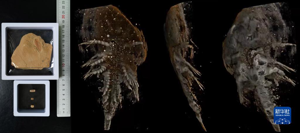 这是一张拼版照片,左边为不同生长时期的迷人林乔利虫化石,右边为云南大学古生物研究院研究员刘煜团队拍摄的迷人林乔利虫不同方位的CT片(10月11日摄)。