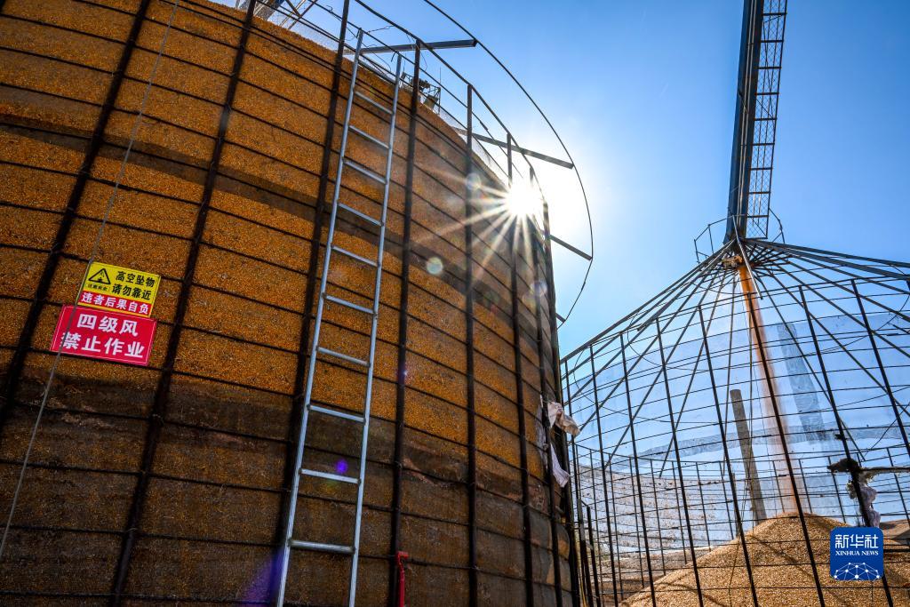 10月15日,在内蒙古通辽市科尔沁左翼中旗腰林毛都镇一家“粮食银行”,经过烘干的玉米储存进粮囤。