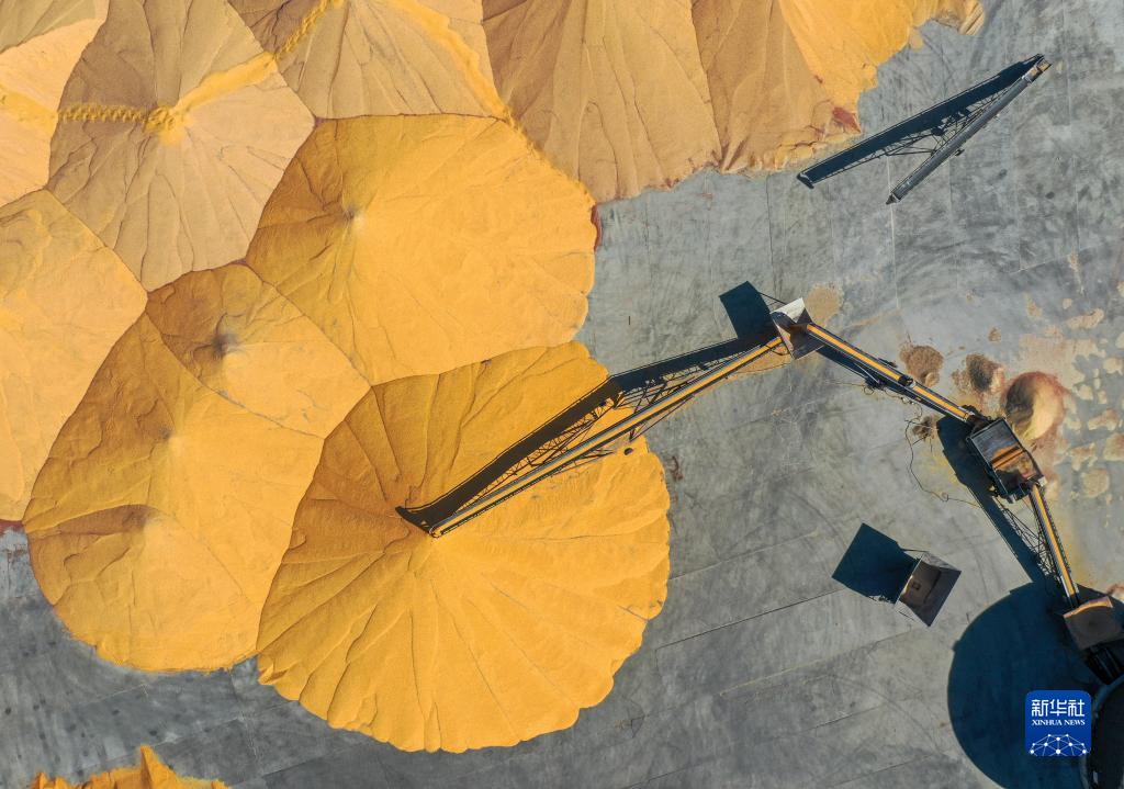 10月15日,在内蒙古通辽市科尔沁左翼中旗腰林毛都镇一家“粮食银行”,经过烘干的玉米堆积如山(无人机照片)。