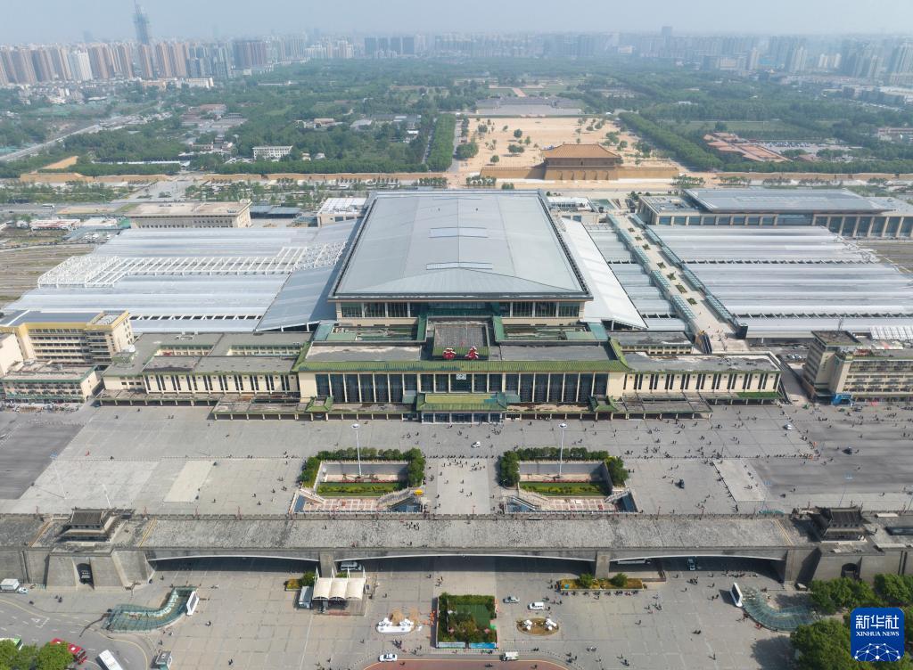 这是西安火车站与其身后的大明宫国家遗址公园(4月25日摄,无人机照片)。