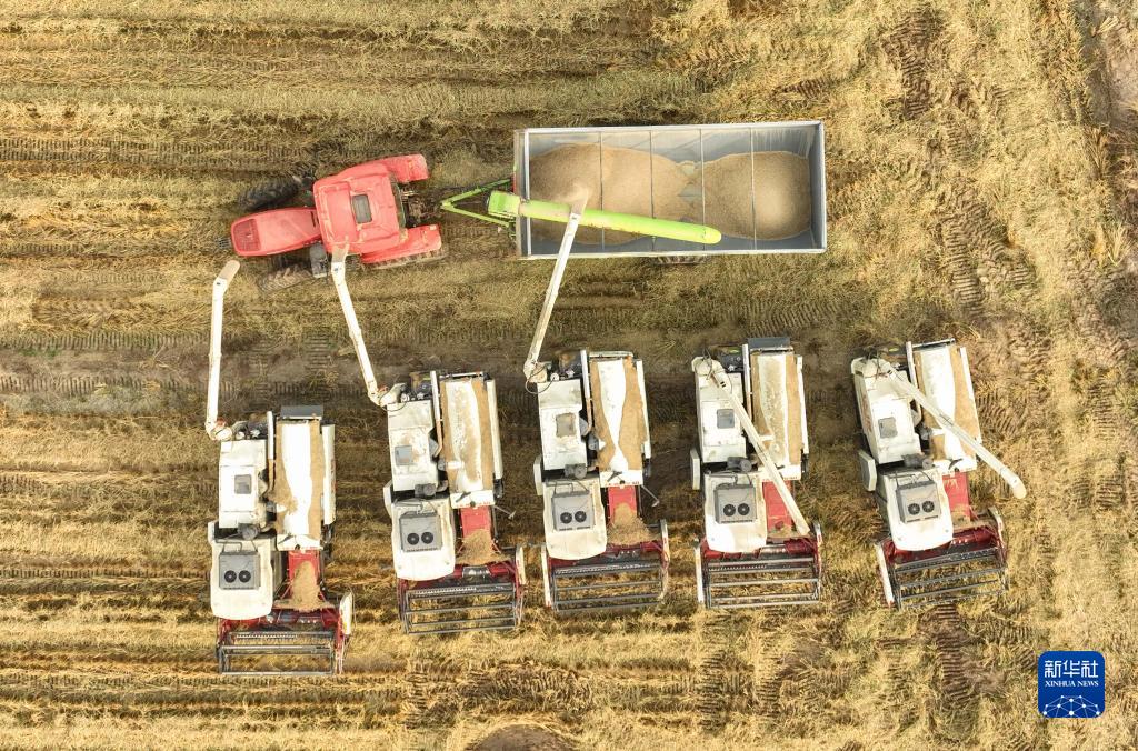 金秋时节,辽宁省阜新市彰武县大冷镇上三家子村的稻田里机声隆隆,一片丰收的繁忙景象。