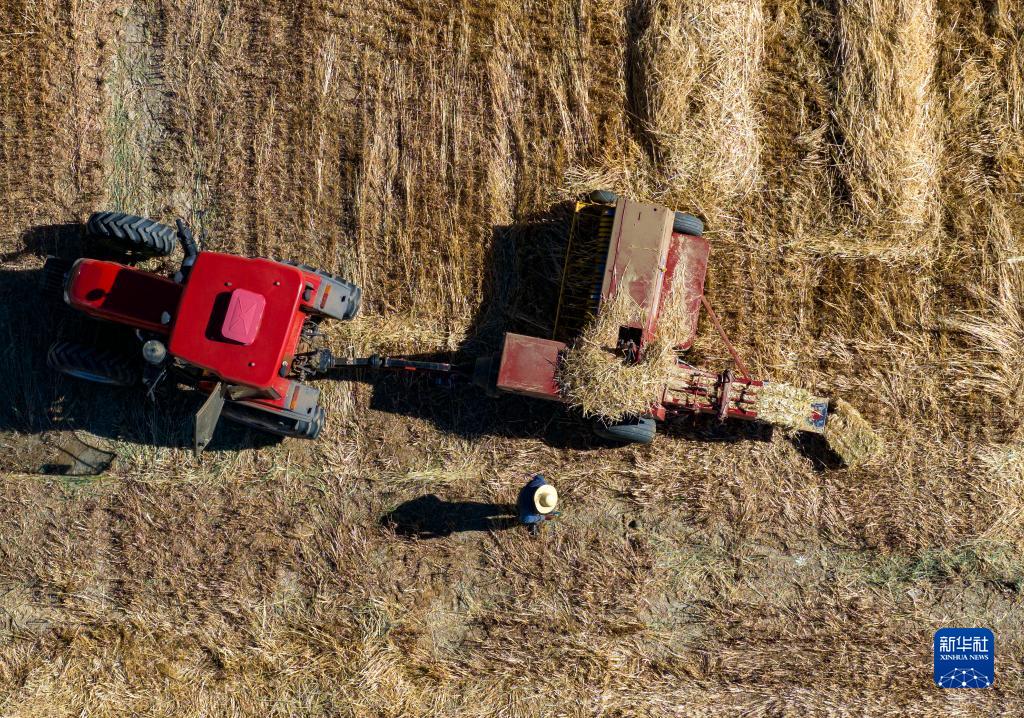 10月24日,村民驾驶农机在拉萨市林周县强嘎乡曲嘎强村将收割过的牧草打包(无人机照片)。