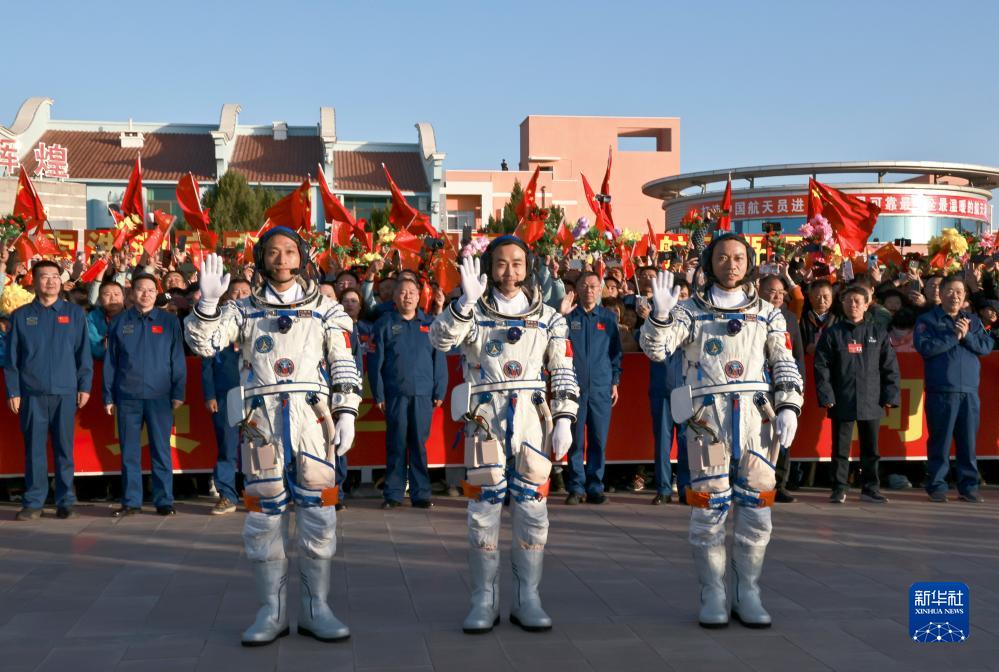 10月26日上午,神舟十七号载人飞行任务航天员乘组出征仪式在酒泉卫星发射中心问天阁圆梦园广场举行。这是航天员汤洪波(右)、唐胜杰(中)、江新林在出征仪式上。