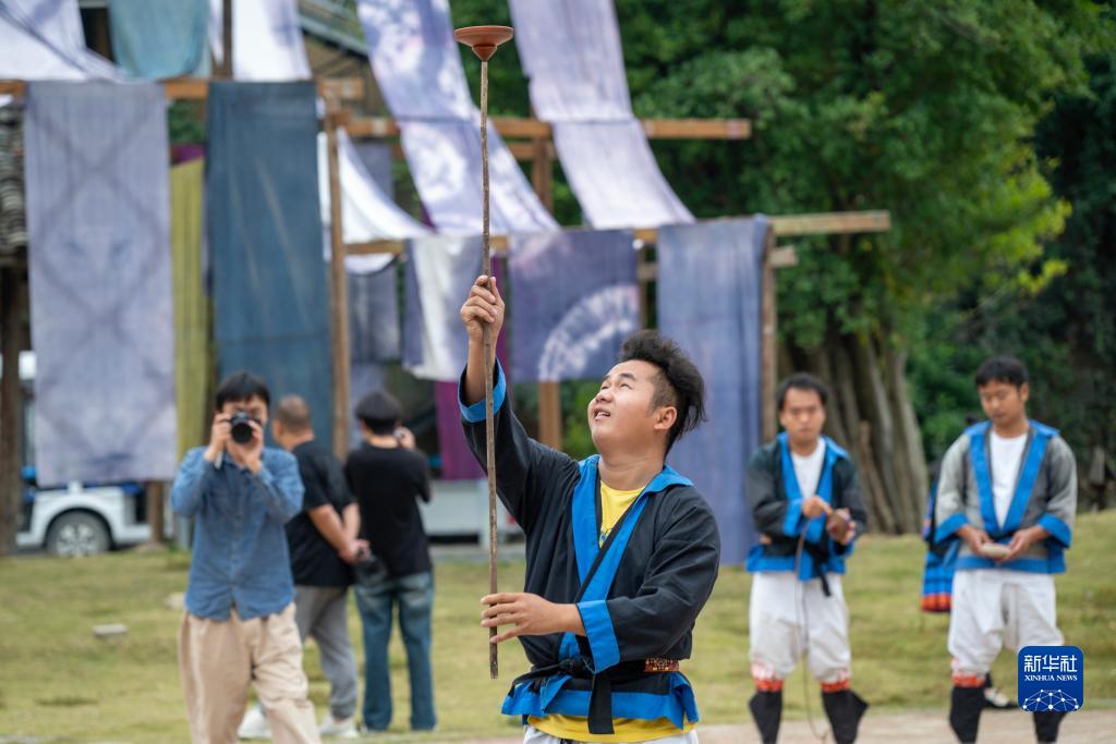 10月26日,表演者在瑶山古寨景区为游客展示陀螺技艺。