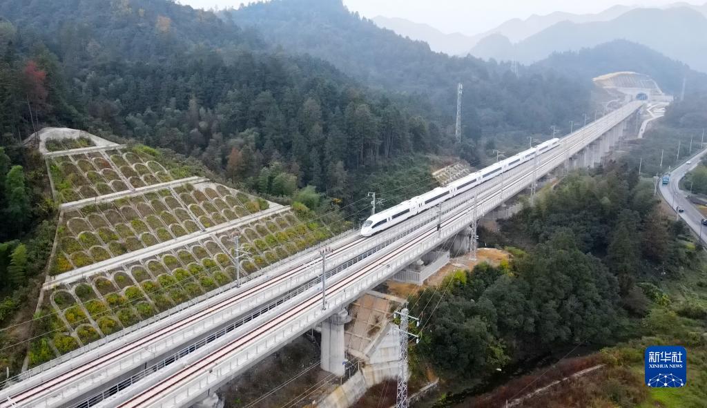 10月26日,试运行列车行驶在昌景黄高铁线上(无人机照片)。