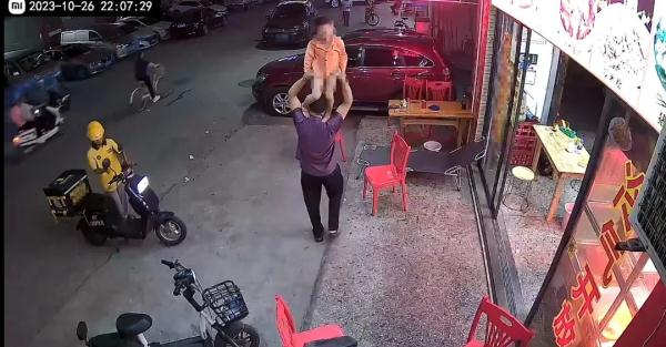 潇湘晨报(报料微信:xxcbaoliao)记者注意到,监控画面显示,事情发生在2023年10月26日22点07分,在一家餐馆门口,一名父亲将儿子反向举过头顶,儿子双脚踩在父亲肩膀上。不料没走几步,意外发生了,儿子从父亲肩头摔下,头砸到了地上。父亲迅速将儿子拦腰抱起,口中呼喊着“儿子、儿子”,而儿子则用手捂着头。