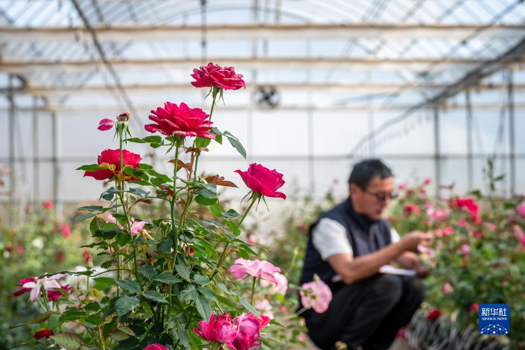 在云南省安宁市现代农业园区玫瑰种植示范园,技术员田连通观察玫瑰花(10月20日摄)。