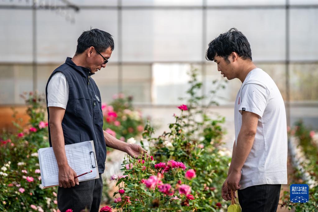 在云南省安宁市现代农业园区玫瑰种植示范园,技术员田连通(左)在和同事交流(10月20日摄)。