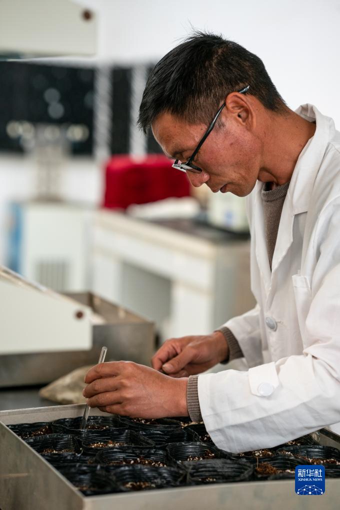 技术员田连通在实验室播种太空种子(4月3日摄)。