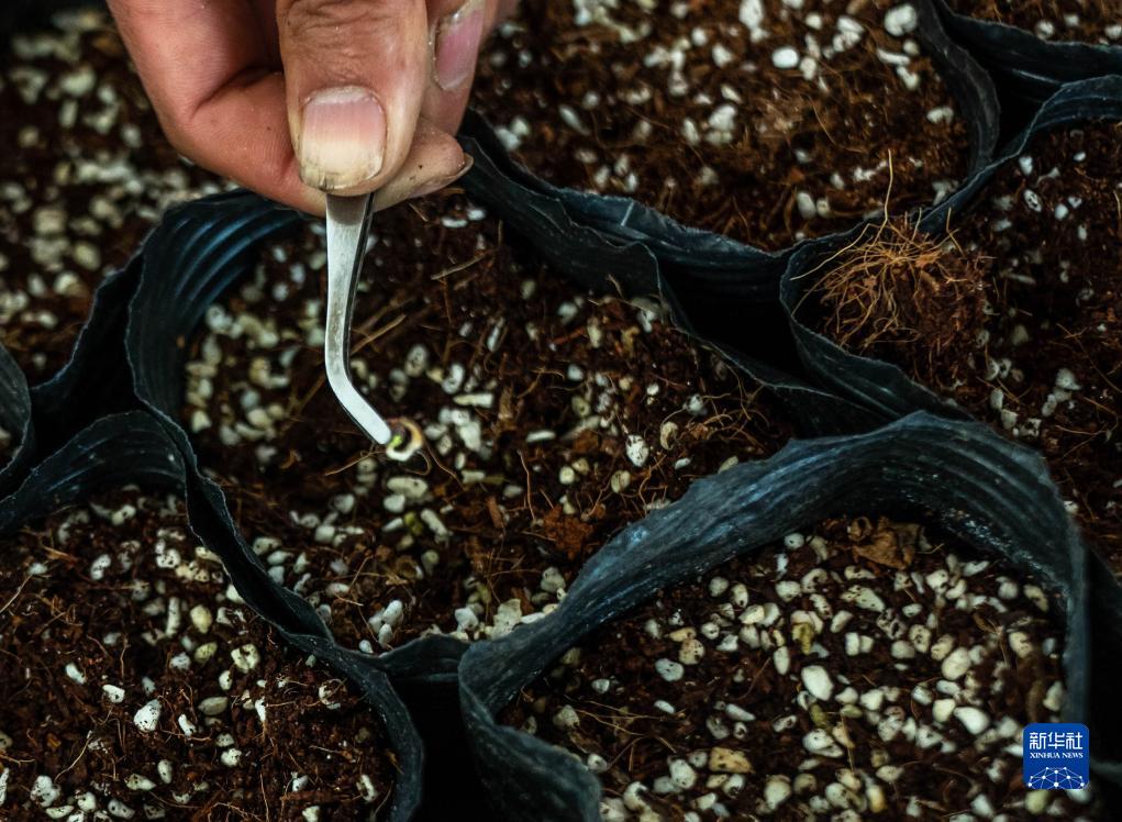 云南锦科花卉工程研究中心里已经发芽的太空种子(4月3日摄)。
