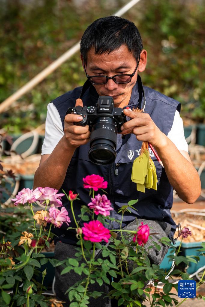 在云南省安宁市现代农业园区玫瑰种植示范园,技术员田连通拍摄玫瑰花(10月20日摄)。