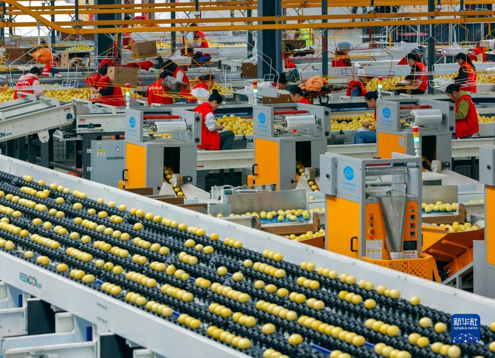 10月31日,在位于四川资阳市安岳县的四川省维记农业集团有限公司,工人在生产线上处理初步挑选好的新鲜柠檬。
