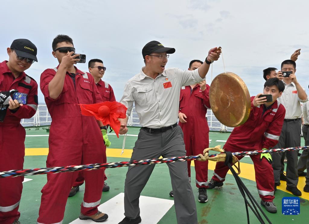 11月10日,中国第40次南极考察队在“雪龙2”号上举行穿越赤道纪念活动。图为考察队副领队魏福海敲锣宣布拔河比赛开始。 新华社记者周圆 摄