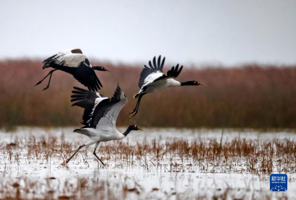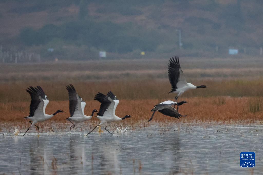 11月18日在贵州草海国家级自然保护区拍摄的黑颈鹤。