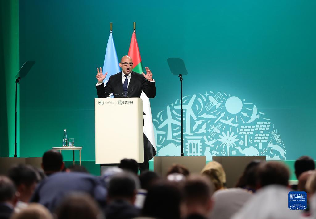 11月30日,在阿联酋迪拜的联合国气候变化迪拜大会开幕现场,《联合国气候变化框架公约》秘书处执行秘书西蒙·斯蒂尔发言。