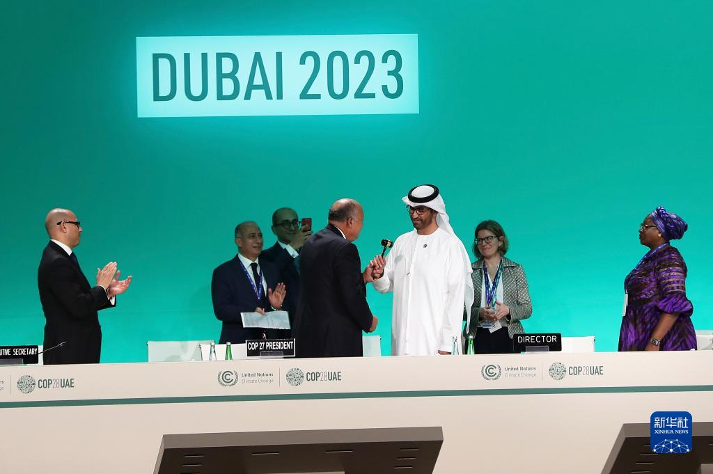 11月30日,在阿联酋迪拜的联合国气候变化迪拜大会开幕现场,COP27主席舒凯里(前左)和COP28主席苏尔坦·贾比尔(前右)交接主席职务。