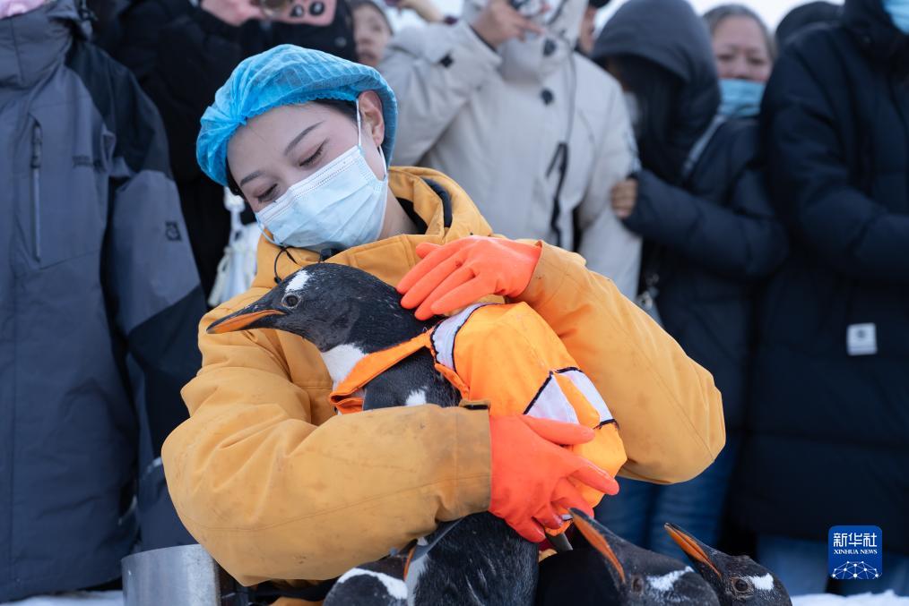 时值周末,哈尔滨极地公园的企鹅亮相户外,上演冰雪巡游,吸引许多游客前来观赏。目前正是黑龙江省哈尔滨市的冰雪旅游季。