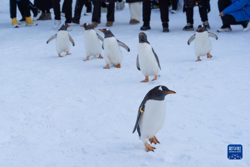 12月3日,哈尔滨极地公园的企鹅在户外进行冰雪巡游。