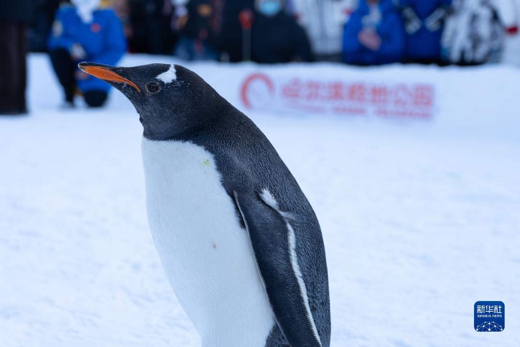12月3日,哈尔滨极地公园的企鹅在户外进行冰雪巡游。