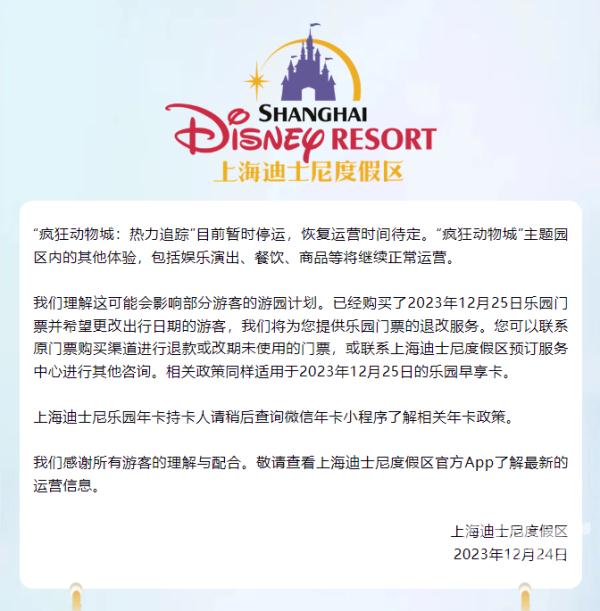 12月24日晚,上海迪士尼度假区发布通知称,“疯狂动物城:热力追踪”目前暂时停运,恢复运营时间待定。“疯狂动物城”主题园区内的其他体验,包括娱乐演出、餐饮、商品等将继续正常运营。