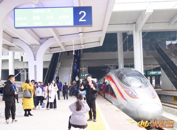 在宜宾站外举行的成宜高铁开通首发活动现场,有不少宜宾本地市民自发前往观看。家离宜宾站仅有10分钟车程的陆大叔,在首发活动开始前半小时便来到了现场,频频举起手机拍摄记录,并和第一时间家人分享成宜开通的好消息。陆大叔说,由于他的岳母住在成都养老院,每周都需要往返宜宾和成都,“到两地的时间缩短了,更加方便了。”