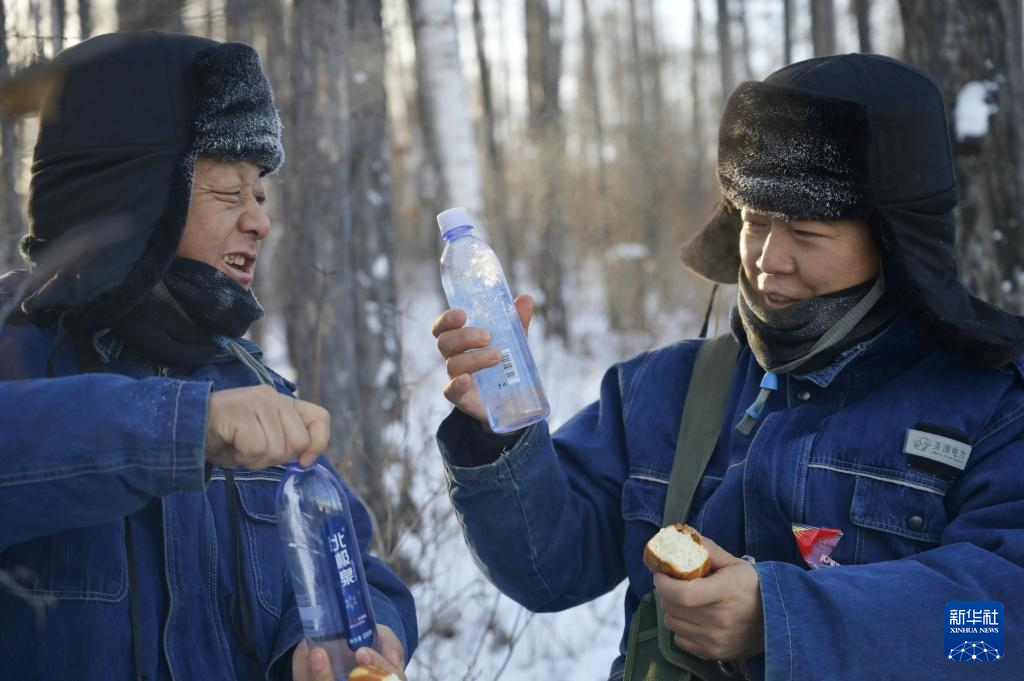 12月23日,在黑龙江省漠河市,电力线路设备运维人员在巡查间隙吃饭休息,他们喝的水已经有部分冻成冰。