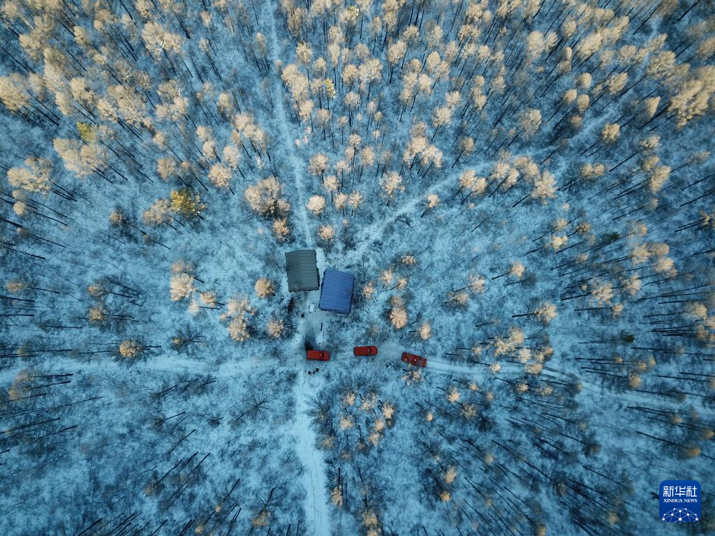 这是12月24日在黑龙江省漠河市北极镇拍摄的北极村周边的一处漠河林场作业点(无人机照片)。